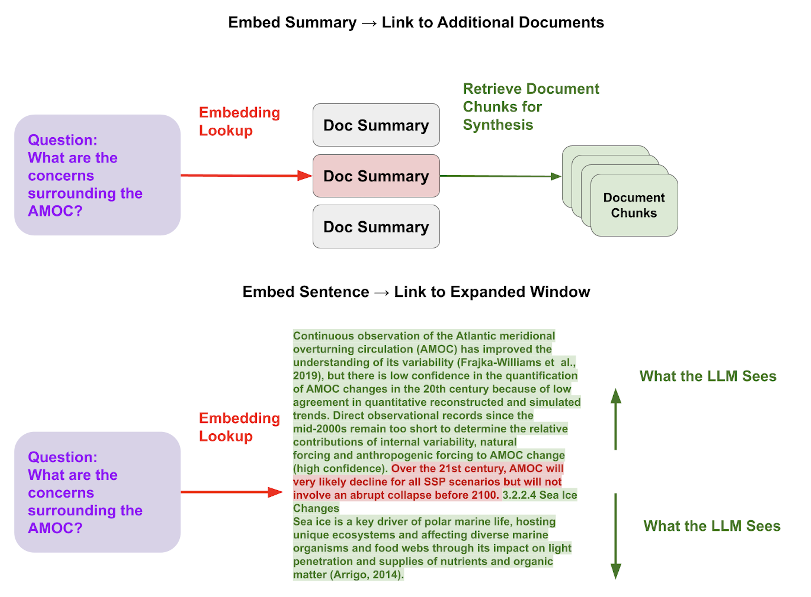 Section titled “Motivation”The optimal chunk representation for retrieval might be different than the optimal consideration used for synthesis. For instance, a raw text chunk may contain needed details for the LLM to synthesize a more detailed answer given a query. However, it may contain filler words/info that may bias the embedding representation, or it may lack global context and not be retrieved at all when a relevant query comes in.