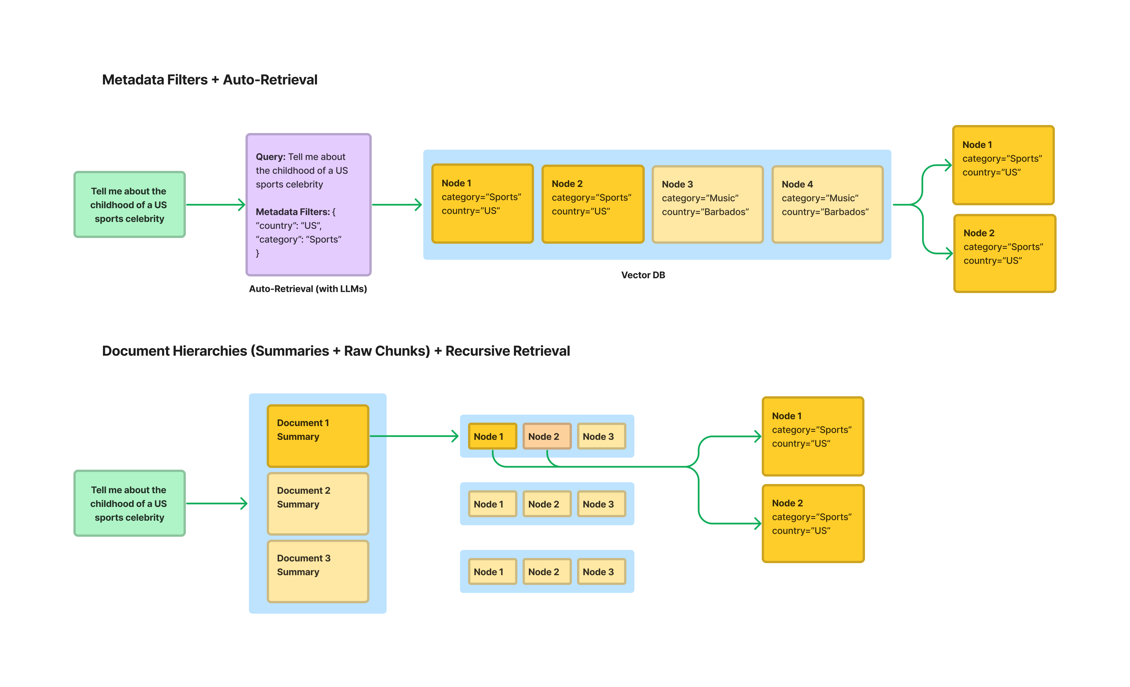 Section titled “Key Techniques”There’s a few ways of performing more structured tagging/retrieval for production-quality RAG systems, each with their own pros/cons.